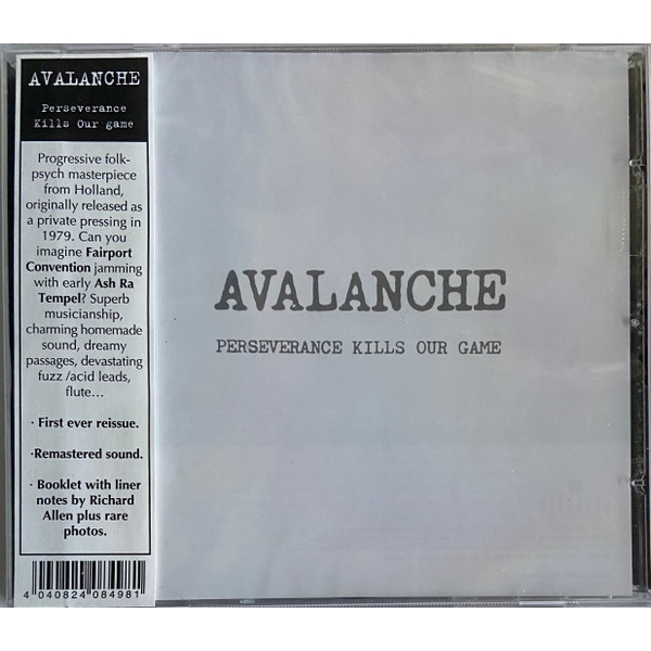 Starannie zremasterowane z oryginalnych płyt winylowych (mastery zostały zniszczone dawno temu) przy użyciu najnowocześniejszego sprzętu, co zaowocowało oszałamiającą jakością dźwięku.Absolutne arcydzieło progresywnego/psychodelicznego folk-rocka z Europy. Holenderski zespół Avalanche powstał na początku lat 70. i nagrał swój jedyny album w 1979 roku. „Perseverance kills our game” ukazał się w prywatnym nakładzie 500 egzemplarzy, które rozdano wyłącznie znajomym i rodzinie. Pomimo tego, że był to projekt domowej roboty (album został nagrany w ciągu jednego dnia!), efekt był oszałamiający.