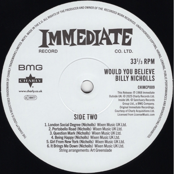 YES, BELIEVE IT! The highly prized Immediate treasure finally gets an official worldwide release almost sixty years after the 100 advance promotional copies landed on radio station desks. Charly records, kick-off their Immediate Records 60th Anniversary celebrations with this landmark album by the then teenager, and still little-known, Billy Nicholls. This cult-status, 12 track, album is drenched in sunshine psych-rock and is often cited as Swinging London’s answer to the Beachboys’ masterpiece Pet Sounds. The lavish arrangements were presided over by Led Zeppelin bassist John Paul Jones with input from the Small Faces and Arthur Greenslade with Ronnie Lane producing. In retrospect, Would You Believe, is an astonishing accomplishment that was conceived and crafted by a 16-years old kid from Shepherds Bush and on its journey rubbed shoulders with George Harrison, Beatles publisher Dick James, Immediate impresario Andrew Loog Oldham and a host of British rock royalty.