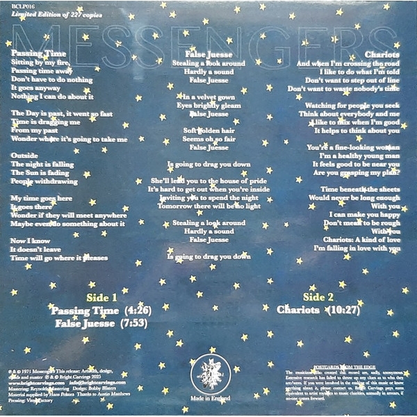 British Prog-Psych Monster from the totally unknown MESSENGERS. Restored and remastered from a unique 1971 acetate discovered by legendary record collector Hans Pokora in a Scottish record shop. Sounding like a lost release from the Nepentha or RCA Neon labels, it's full of swirling organ, searing guitar solos, complex jams and mystical lyrics. The sleeve is also a real framer, an authentic primitive painting produced in a South London squat in 1973 in return for a quid deal of Red Lebanese and two litres of rough red wine. Once again, Bright Carvings brings to you the authentic sights and sounds of the British Underground.