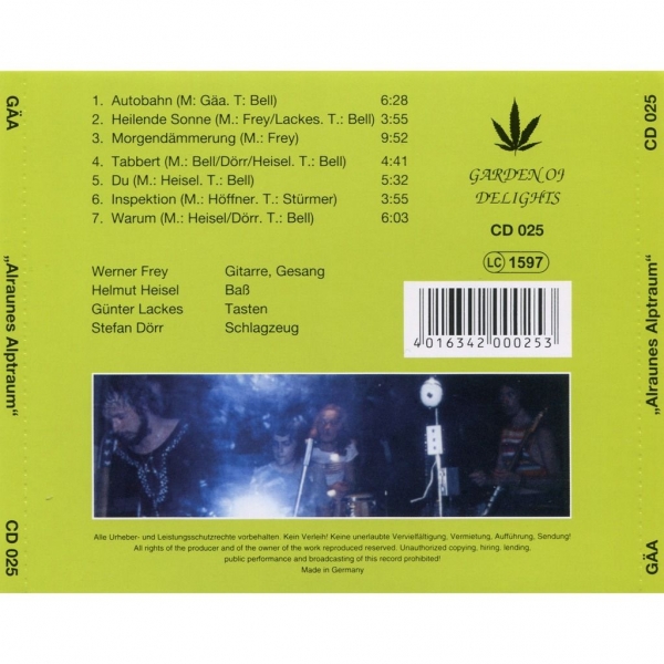 Gäa from the German state of Saarland have become quite known in collectors’ circles thanks to their LP "Auf der Bahn zum Uranus" from 1974. In early 1975 they recorded three tracks for a, however, unfinished second album. They are simply brilliant and show how mature and inventive the band was at that time. The tracks have been rediscovered only recently and form the heart and major part of the CD, which also contains four minor bonus tracks from the 80s. Although these tracks are no longer progressive in the strict sense, they have been added for the sake of completeness and because there was time left. The cover artwork is again by Eduard Bell and shows the Alruna, a legendary earth spirit from Germanic mythology and a rough counterpart to Gäa, the ancient Greek goddess of the Earth.