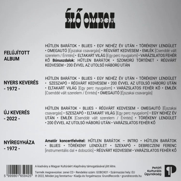 Ez alkalomból egy különleges díszdoboz lát napvilágot az Omega-rajongók nagy örömére. Az exkluzív megjelenésű, fémes borítású dobozba 4 CD, egy képeskönyv, és az eredeti kiadású hanglemez betétlapja került bele. Az első korong megegyezik a normál kiadványéval, ami tartalmazza a remaszterizált eredeti albumot és a lemezhez kapcsolódó két kislemez 4 dalát. A második CD az album nyers keverését tartalmazza 1972-ből. Ez a hanganyag -túl azon, hogy nem tartalmaz közönségzajt-, eltér az eredeti keveréstől. A hangfelvétel az eredeti állapotában, minden utómunka nélkül került rá a CD-re. A harmadik CD-n Rozgonyi Péter vadonatúj, 2022-es keverésében hallgatható meg az anyag, ami az eredeti, soksávos szalagról készült Molnár 'Elefánt' György felügyelete mellett. A negyedik CD pedig egy amatőr élő felvétel 1972-ből (orgonaszólóval, dobszólóval, eredeti Szexapóval). Nem tokéletes hangminőségű anyag, de kiváló kordokumentum!