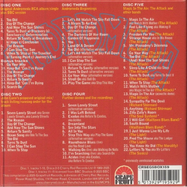 The first four CDs collect everything recorded by the band, while Disc Five rounds up the pre-Andromeda story with tracks from The Attack and more obscure ventures, including two previously unissued cuts from the first outfit that Cann and bassist Mick Hawksworth had played in together, The Mailtown Blues Band.